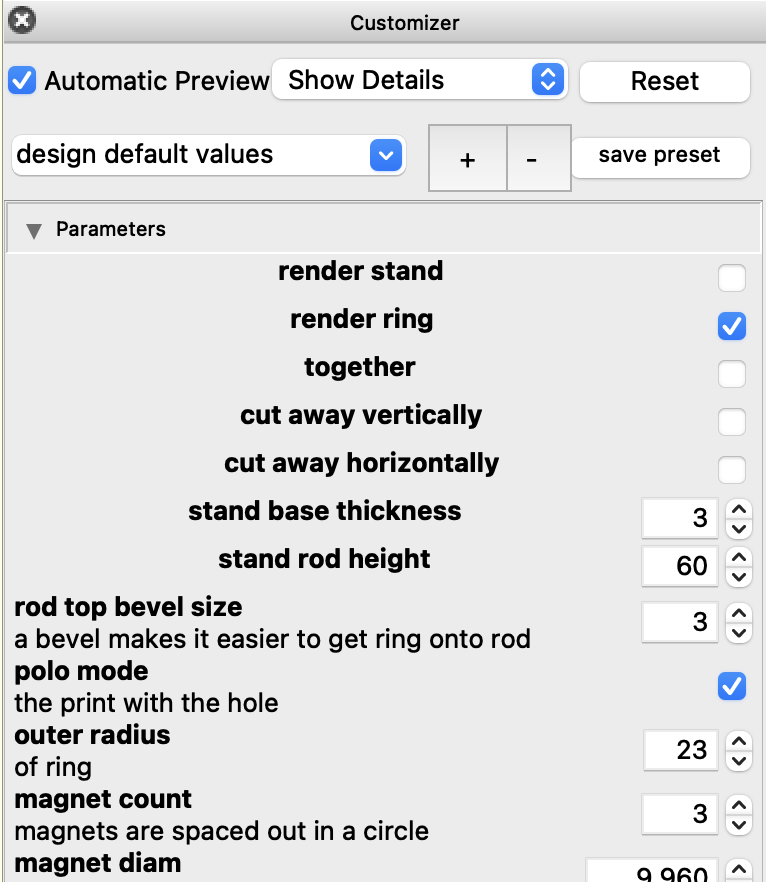 The customizer provides a UI for adjusting the properties at the top of your script. You can save named sets of properties (they’re all persisted in a single json file next to your script).
